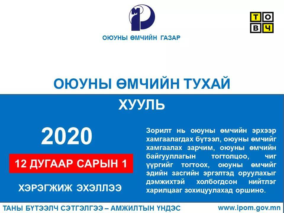 Оюуны өмчийн эрхээр хамгаалагдах бүтээл, оюуны өмчийг хамгаалах зарчим, оюуны өмчийн байгууллагын тогтолцоо, чиг үүргийг тогтоох, оюуны өмчийг эдийн засгийн эргэлтэд оруулах, дэмжихийг зохицуулсан “Оюуны өмчийн тухай хууль” өнөөдрөөс /2020.12.01/ хэрэгжиж эхэллээ.