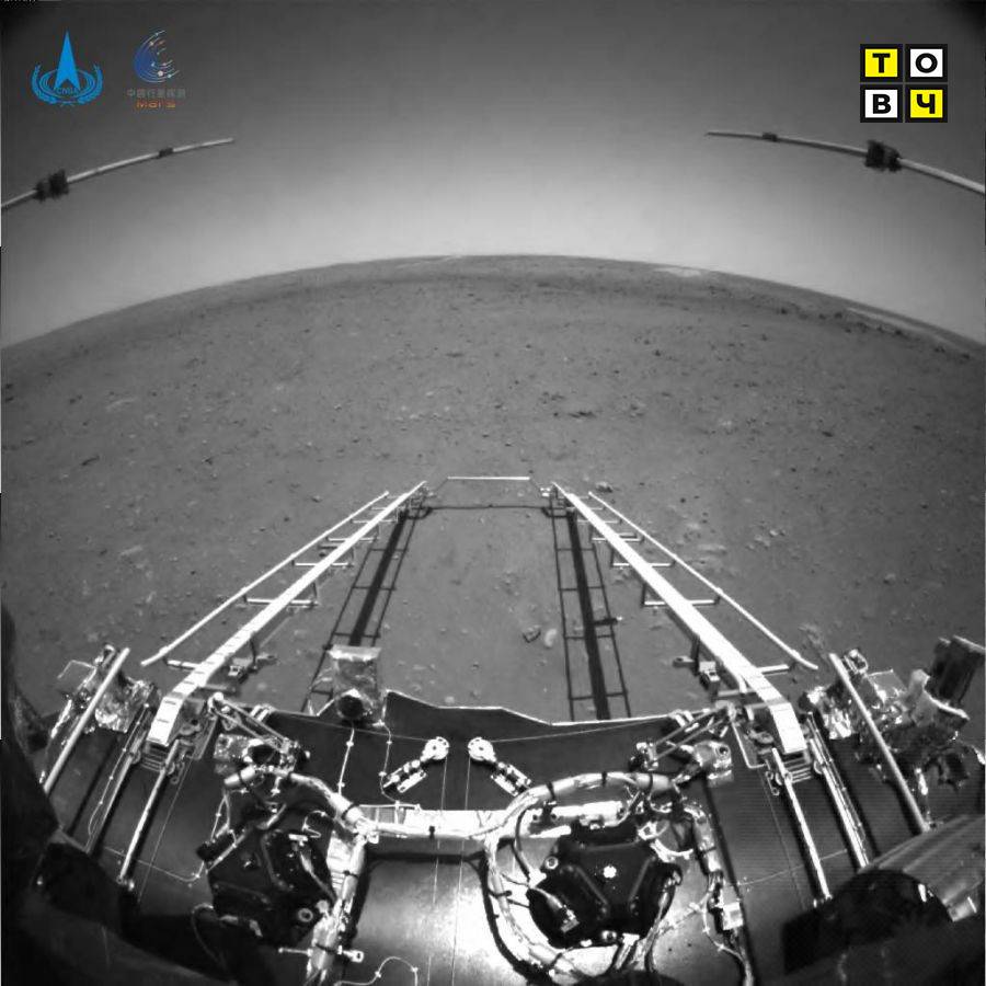 Уг аппаратын илгээсэн эхний хар цагаан гэрэл зурагт Ангарагнаа явагч “Zhurong” төхөөрөмжийн налуу замыг гаргийн гадаргуу руу буулгасан байгааг харуулжээ.