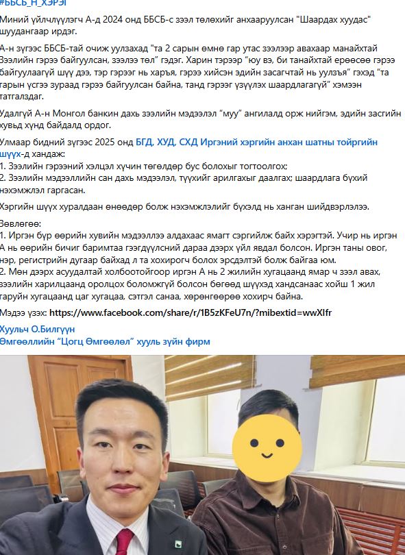 Иргэн А гурван жилийн өмнө бичиг баримтаа алджээ. Улмаар 2024 онд түүний гар утсанд ББСБ-аас зээлээ төлөхийг шаардсан мессэж иржээ. Иргэн А Т тухайн ББСБ-тай өөрийн биеэр очиж уулзахад   гар утасны зээлийн гэрээ хийснийг дурджээ. Харин зээлийн гэрээтэй танилцах хүсэлт гаргасан ч түүнд гэрээг танилцуулаагүй байна. Иргэн А-ийн бичиг баримтыг олсон иргэн Б-нь  ББСБ-аас бичиг баримтыг нь ашиглан  “iphone 15 promax” гар утсыг зээлээр авч 10 орчим сая төгрөгийн хохирол учруулахын зэрэгцээ, хар жагсаалтад оруулжээ.