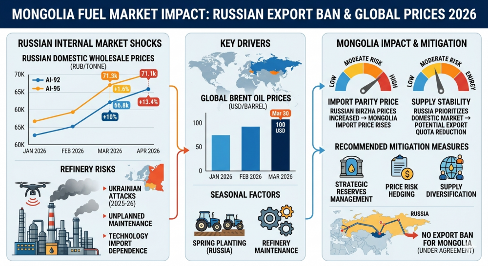 1. Үнийн импорт: ОХУ-ын дотоод биржийн үнийн өсөлт нь манай хилийн үнэд шууд тусаж, ойрын хугацаанд жижиглэнгийн үнэ өсөх магадлалыг нэмэгдүүлэх.