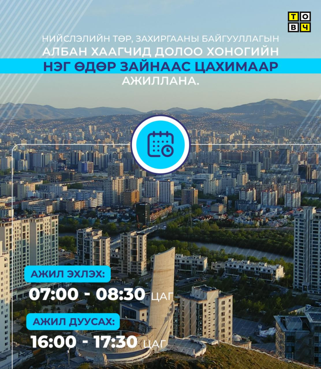 Мөн төрийн байгууллагын үйл ажиллагааны хэвийн, тасралтгүй, шуурхай байдлыг алдагдуулахгүйгээр ажлын зайлшгүй шаардлагаас бусад тохиолдолд нийслэлийн төр, захиргааны байгууллагын албан хаагчид 2026 оны 4 дүгээр сарын 20-ны өдрөөс долоо хоногийн нэг өдөр зайнаас цахимаар ажиллана.